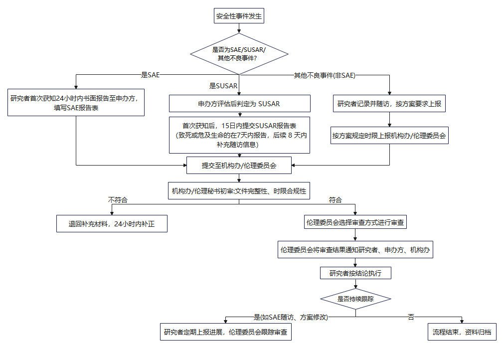 (1)本中心SAE:研究者在首次获知SAE后24小时内报告至医学伦理委员会及申办者,在获知SAE的新信息后,应当及时提供详尽、书面的随访报告或总结报告。